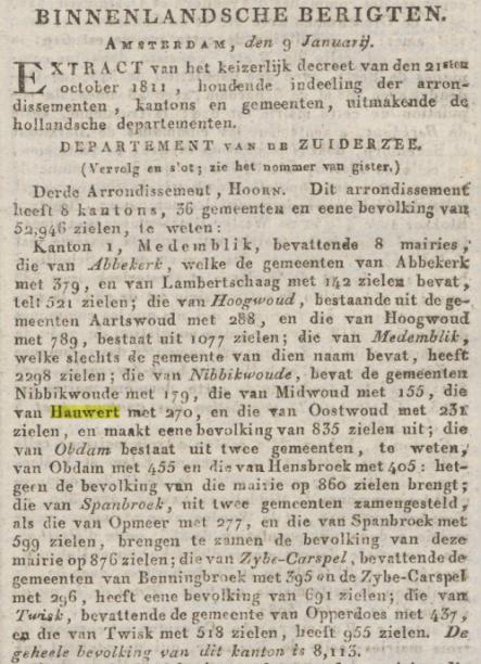 De Franse Gemeentewet van 1811 bepaalde daarom een minimale omvang van 500 inwoners. In Hauwert woonden 270 personen.