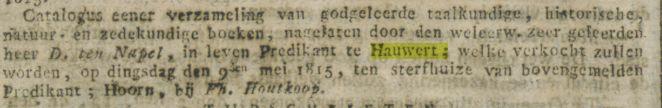 Opvallend: op deze lijst komt ook de predikant van Hauwert uit die tijd, Dirk ten Napel, voor. De dominee overleed een jaar erna, in 1815.