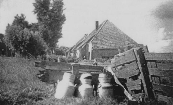Boerderij W. Bakker, de melkbussen van W. Koeman.